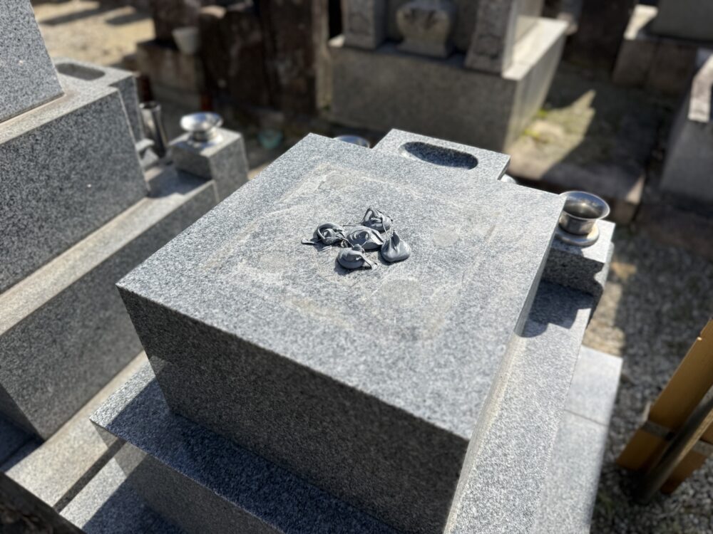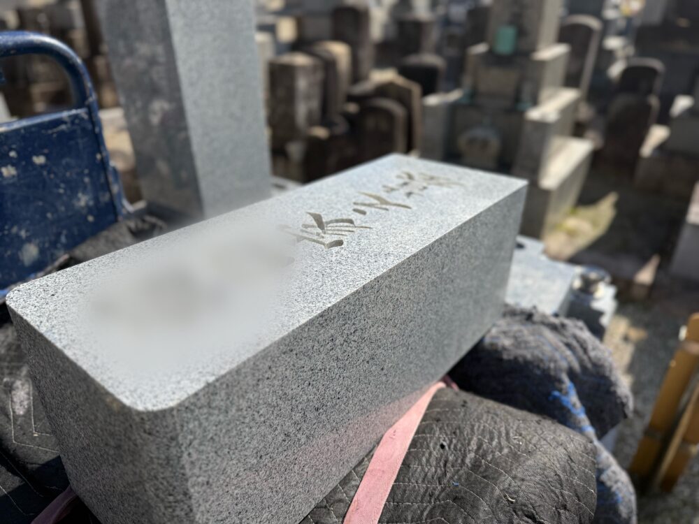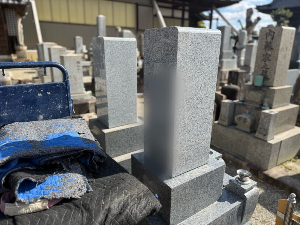 刈谷市内お寺様墓地にて平成15年建立8寸角石塔追加彫り工事の竿石の据付けをさせていただきました。
