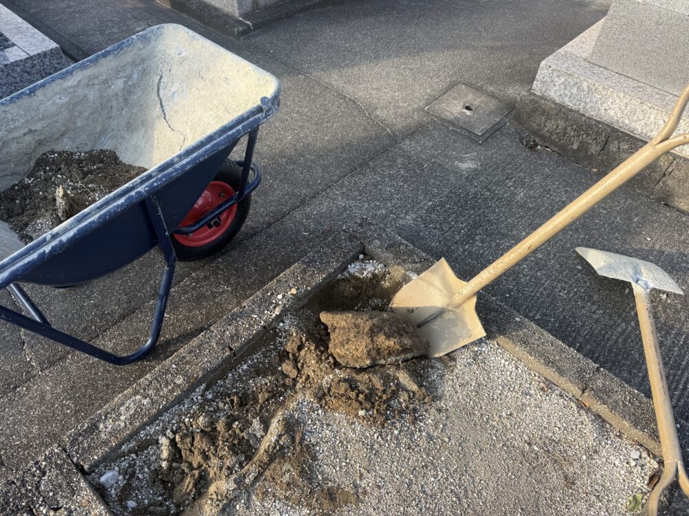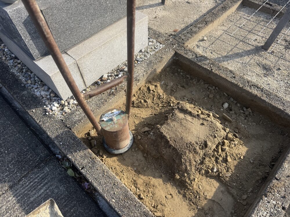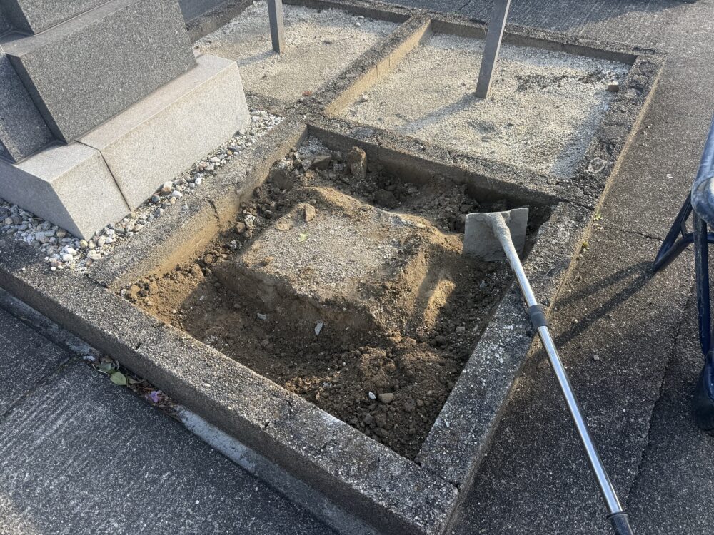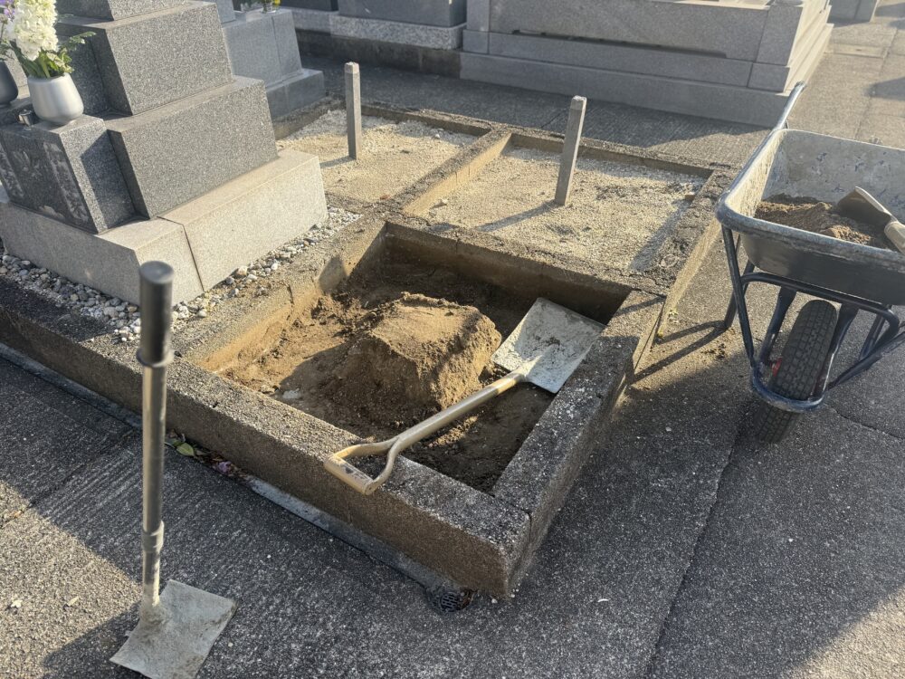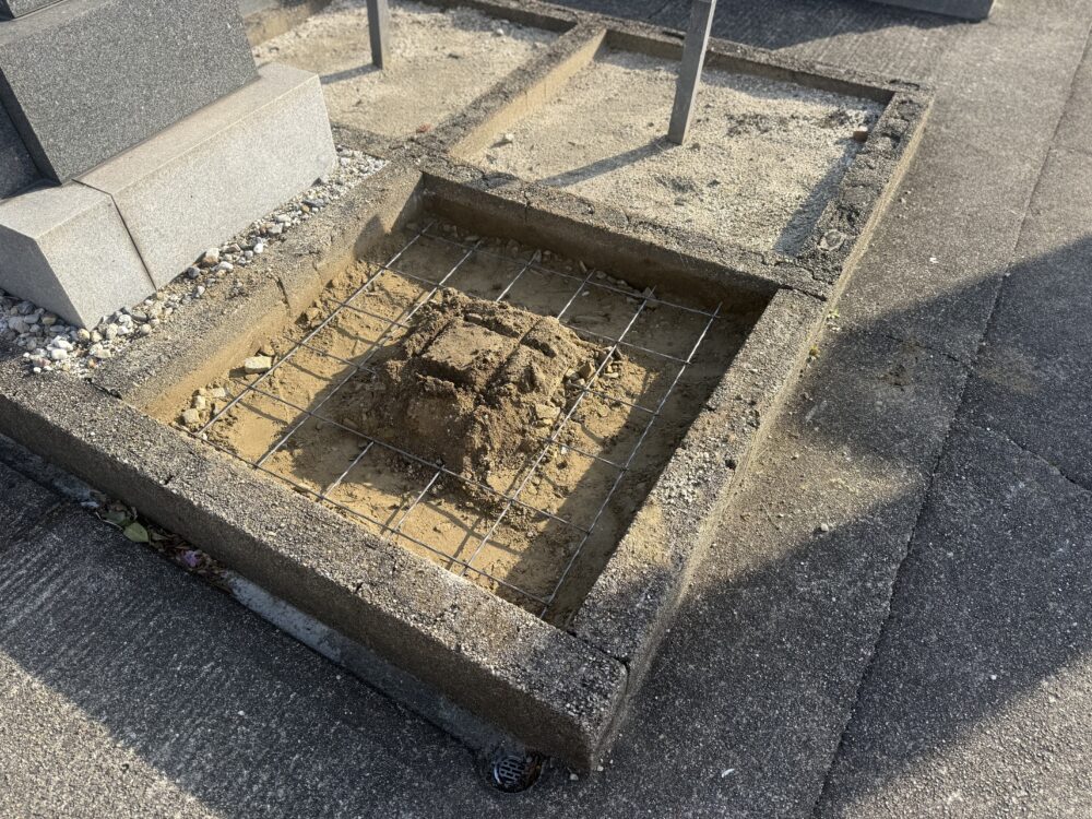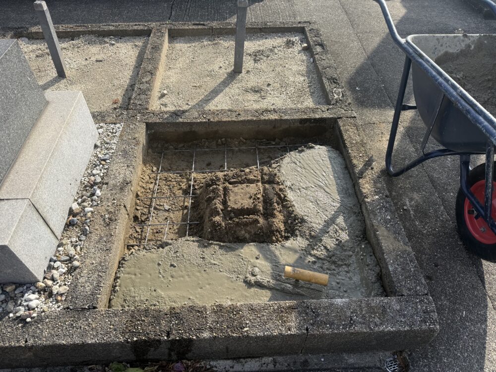 刈谷市内お寺様墓地にて、アーバングレーいづかオリジナル和墓8寸角R型 石塔新築工事の基礎工事をさせていただきました。