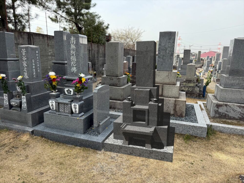 刈谷市内お寺様墓地にて、大島(石善碧)いづかオリジナル和墓 8寸角R型石塔新築工事のイメージ変更をさせていただきました。
