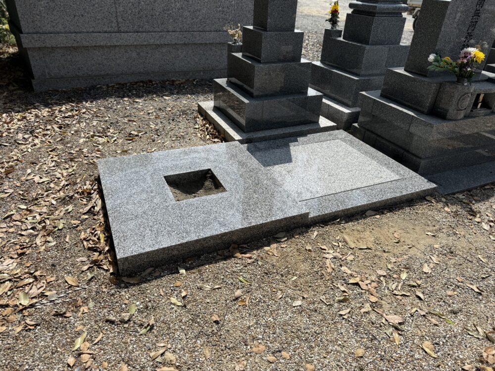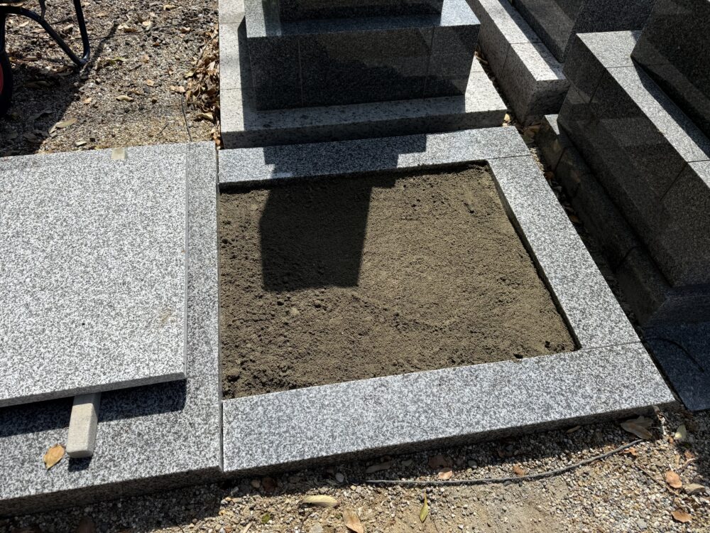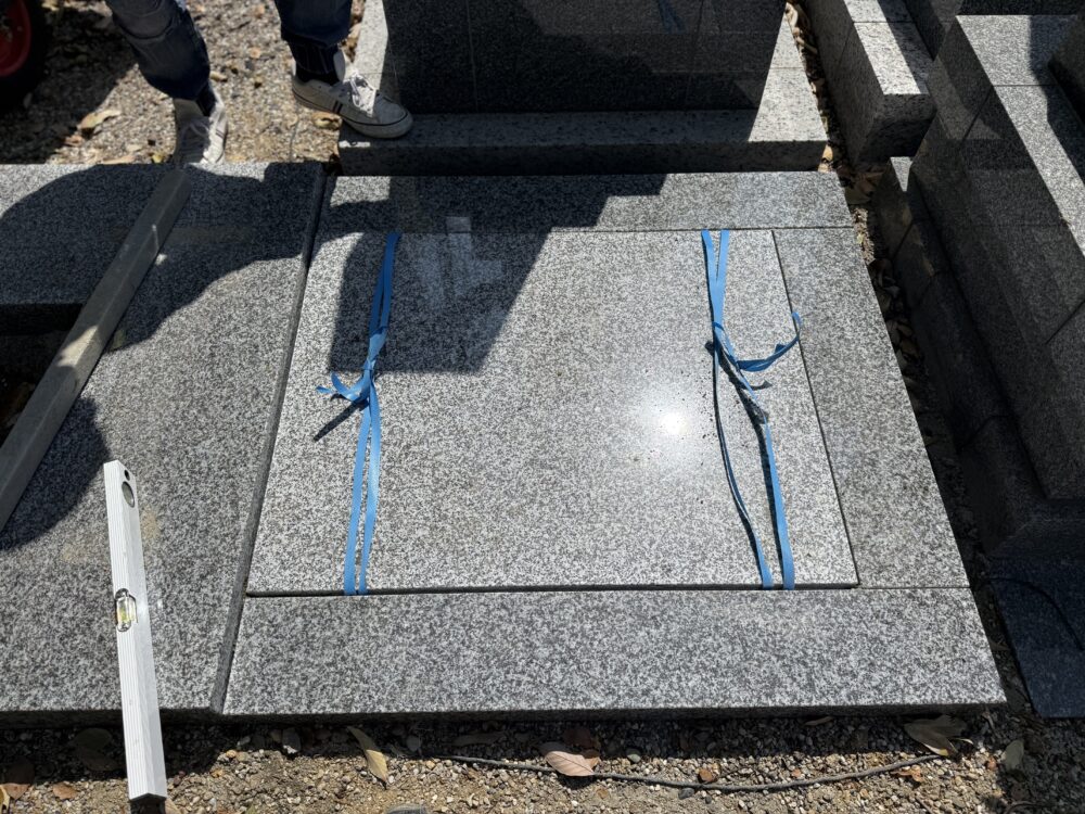東浦町内お寺様墓地にて、昭和62年建立、石塔 移設工事の貼石工事の作業させていただきました。