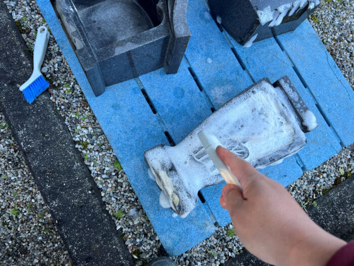 💡酸性の洗剤で苔を洗い流します。苔の除去はお墓の長持ちにも繋がります。