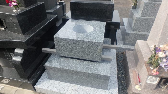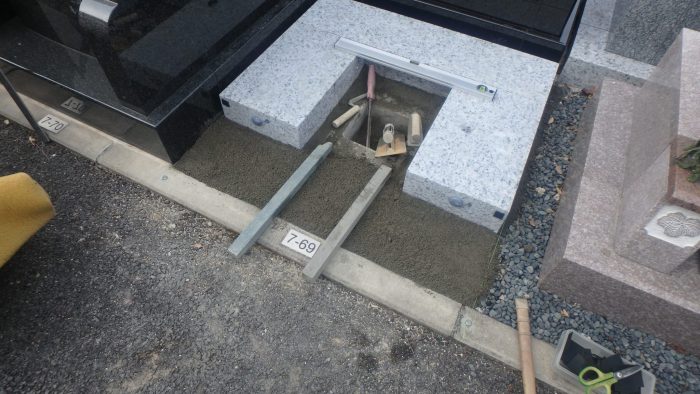 中台の据付け、上台とサオ石は墓石用免震ボンドに加えて免震パッド絆で更に地震対策です。