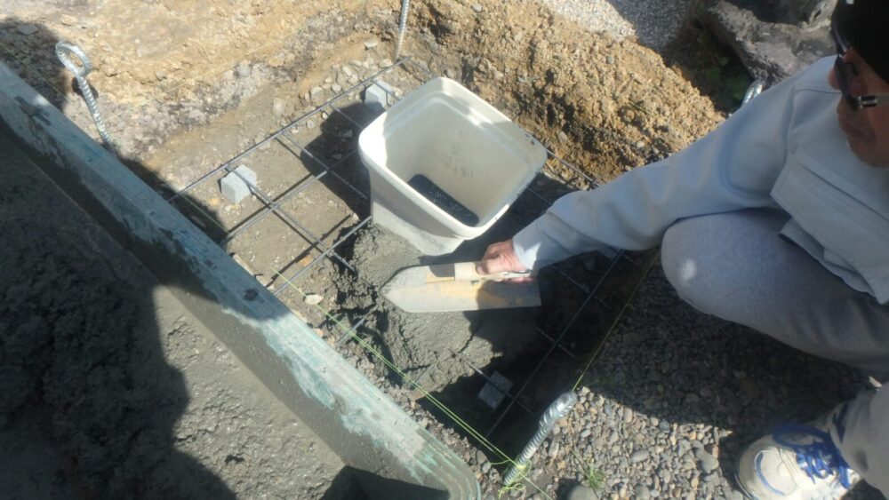 お墓を解体して、レベル出し、掘削、砕石を敷いてランマーで転圧、ワイヤーメッシュで