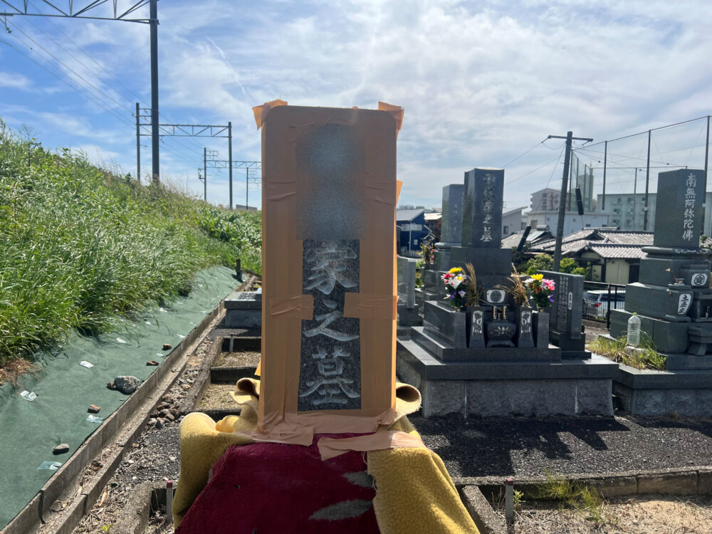 刈谷市内地域墓地にて、平成7年建立石塔 墓誌追加彫り工事 スタンダードペイントの施工をしました。