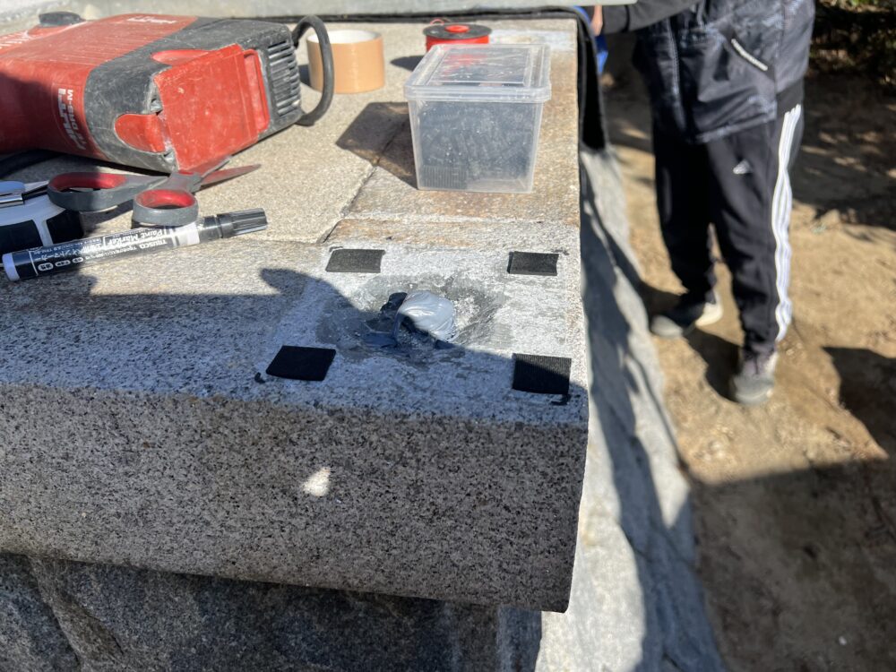 玉垣の据直しをしました。既設玉垣を解体、新規玉垣を墓石用免震ボンドと心棒による補強で据付けております。拝石も大判で貼らせていただいております。次回、目地入れとなります。引き続きよろしくお願いいたします。