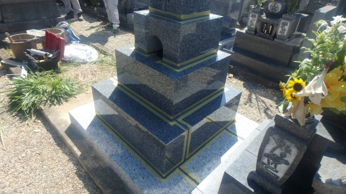 目地にも《墓石用免震ボンド》を込んで、トーバ立、花立、水鉢、