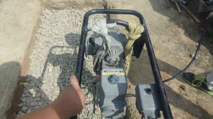 砕石敷き、ランマーでの転圧、コンクリートを打設して