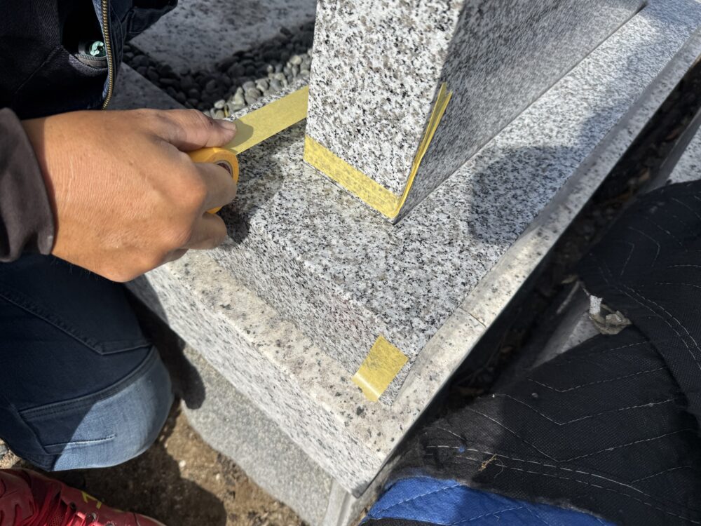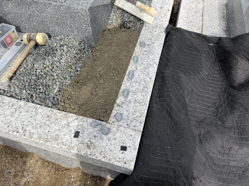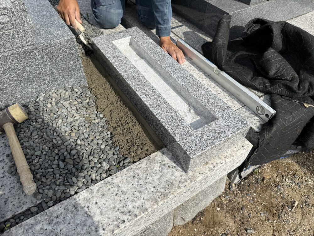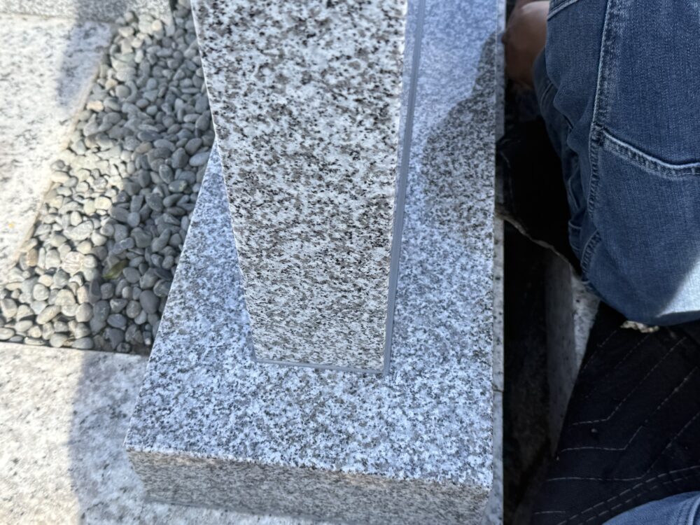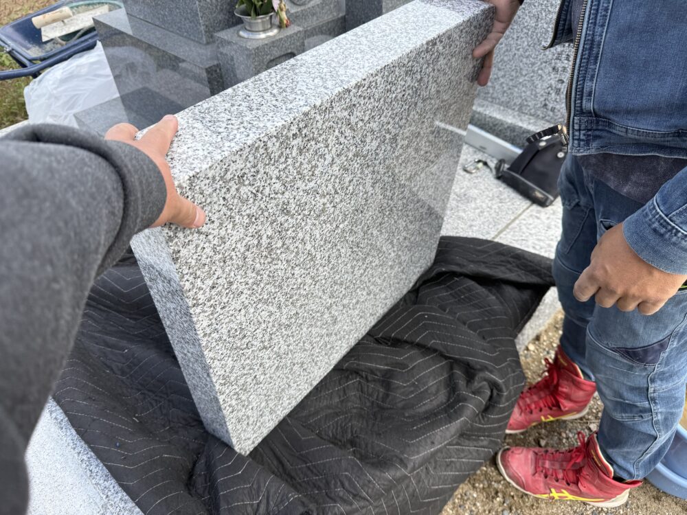 墓誌新築工事の施工完了です。墓石用免震ボンドでしっかりと接着いたしました。埋め込み式なのでデザインとしても地震に強いです。ご用命いただきありがとうございました!