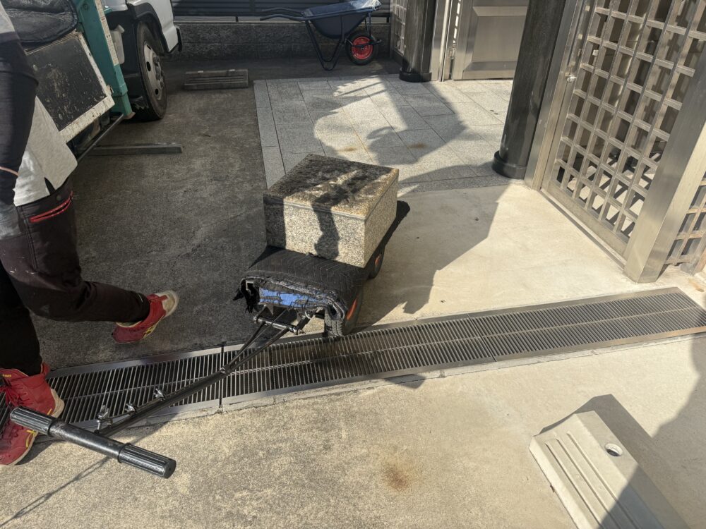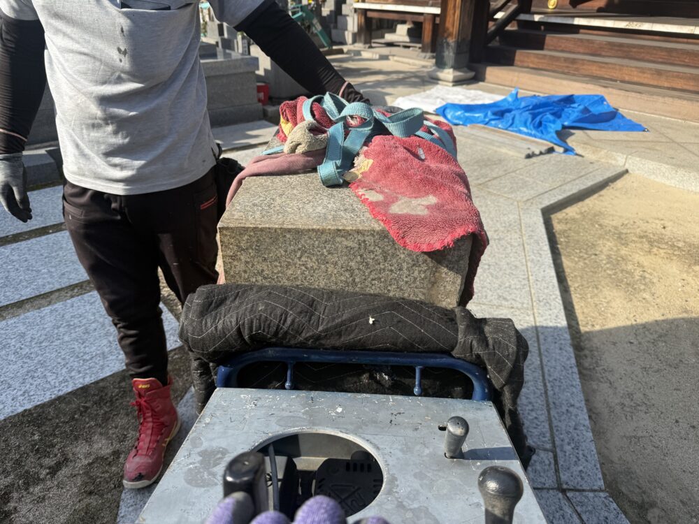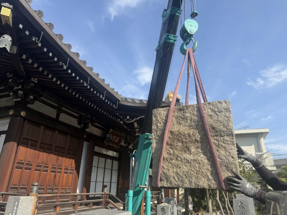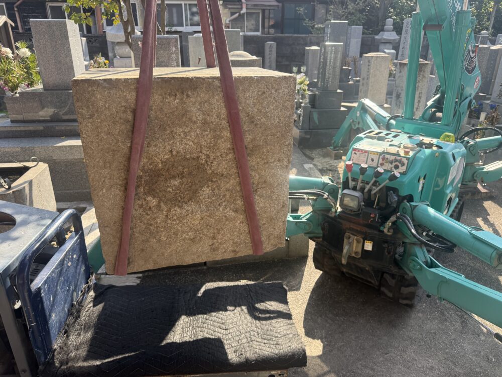 五輪塔移設工事、既設石塔の解体工事でした。下台は350キロもあり、通路も狭く最終的にはカニクレーンで施工致しました。次回、基礎工事となります。引き続き宜しくお願い致します。