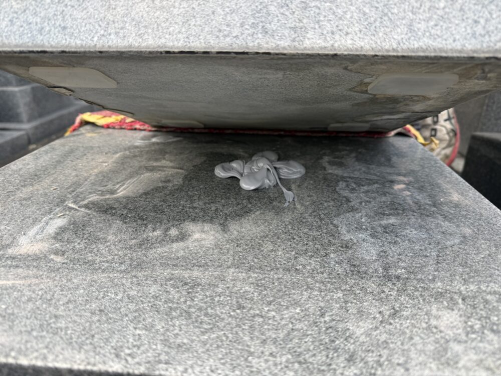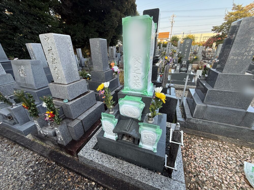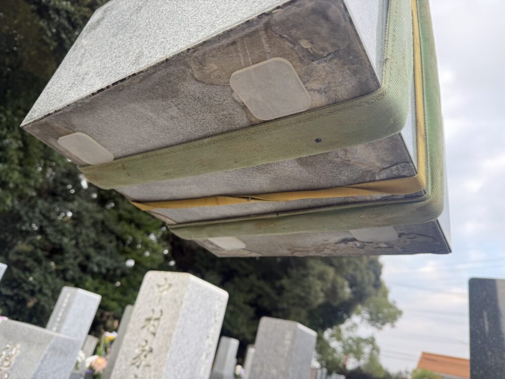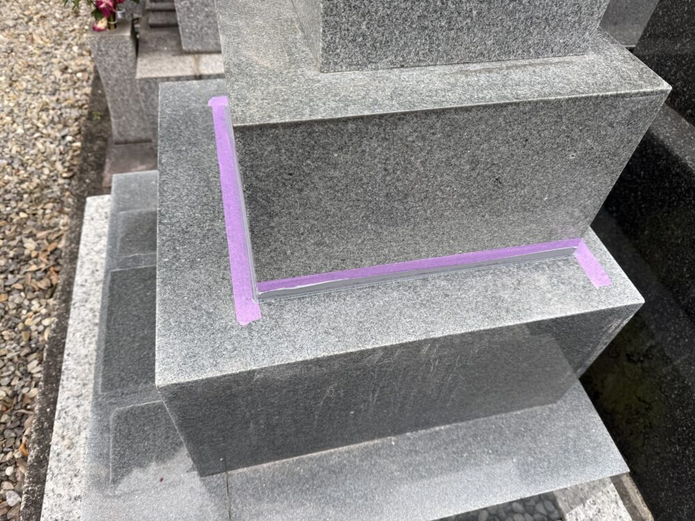 追加彫り工事、免震マット絆と墓石用免震ボンドで地震対策をしました。また色入れ直しをしました。仕上げは来週を予定しております。引き続き宜しくお願い致します。